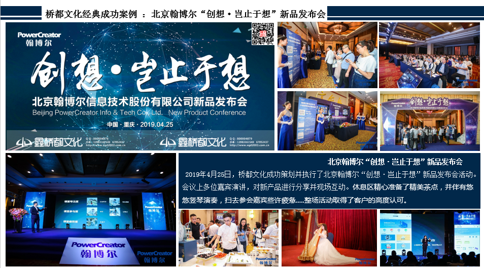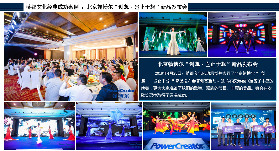 桥都文化成功策划并执行了北京翰博尔“创想·岂止于想”新品发布会活动。会议上多位嘉宾演讲,对新产品进行分享并现场互动。休息区精心准备了精美茶点,并伴有悠悠竖琴演奏,扫去参会嘉宾些许疲惫,晚上的答谢宴现场不仅为客户准备了丰盛的晚宴,更为大家准备了炫丽的歌舞、精彩的节目、丰厚的奖品.....整场活动取得了客户的高度认可。