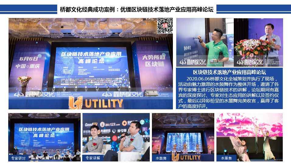 2020.06.06桥都文化全城策划并执行了现场,活动由魅力激昂的水鼓舞作为整体开场,邀请了各界专家博士进行区块链技术的讲解,论坛期间有嘉宾的深度探讨、专家对生态应用的讲解以及签约仪式,最后以异彩纷呈的水墨舞完美收官,赢得了客户的高度好评。