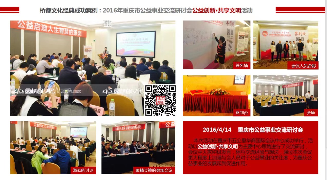 本次活动在重庆市五公里华商国际会议中心成功举行,活动以公益创新·共享文明为主要中心思路进行了交流研讨,会议中大家积极发言,相互交流经验与想法,通过本次会议更大程度上加强与会人员对于公益事业的关注度,为重庆公益事业的发展起到促进作用。